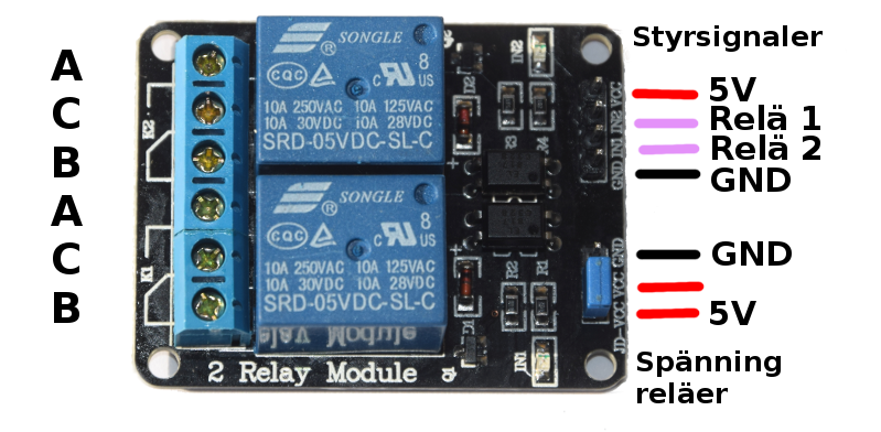 En fungerande inkoppling av relämodulen kan alltså vara enligt nedan. Vi kanske vill att signalen från en