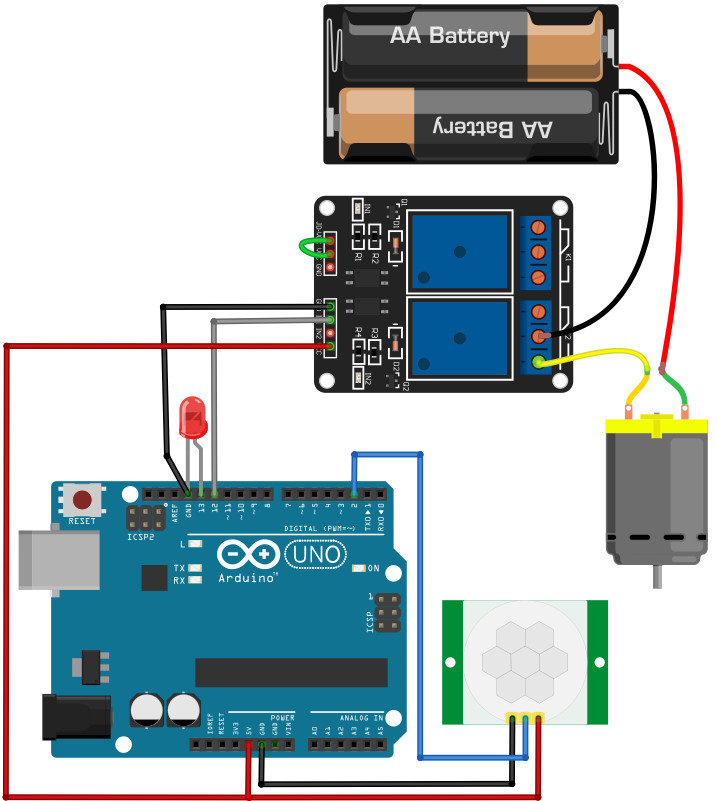 rörelsesensor skall starta en motor eller en lampa i ett rum. Då kan vi koppla såhär.